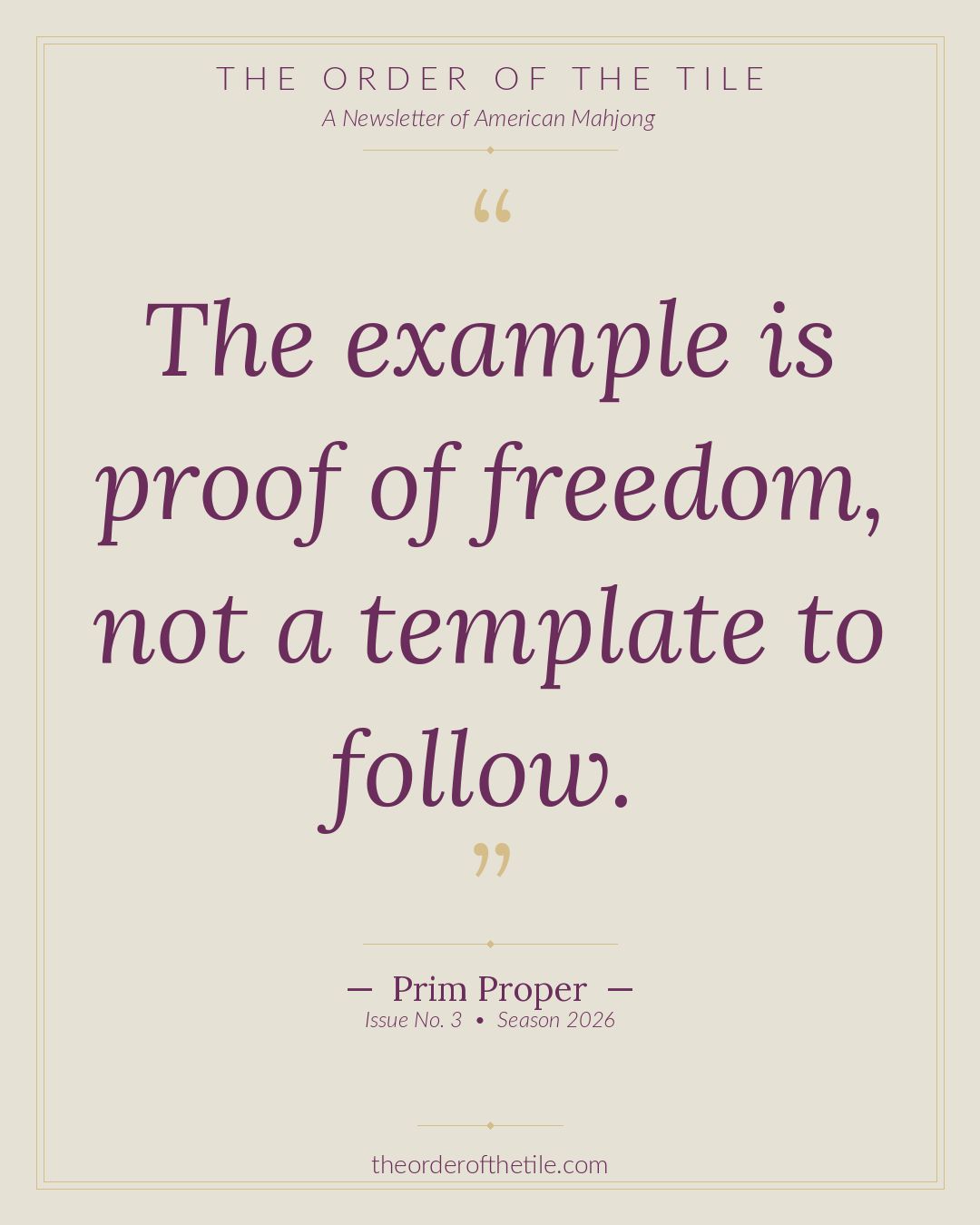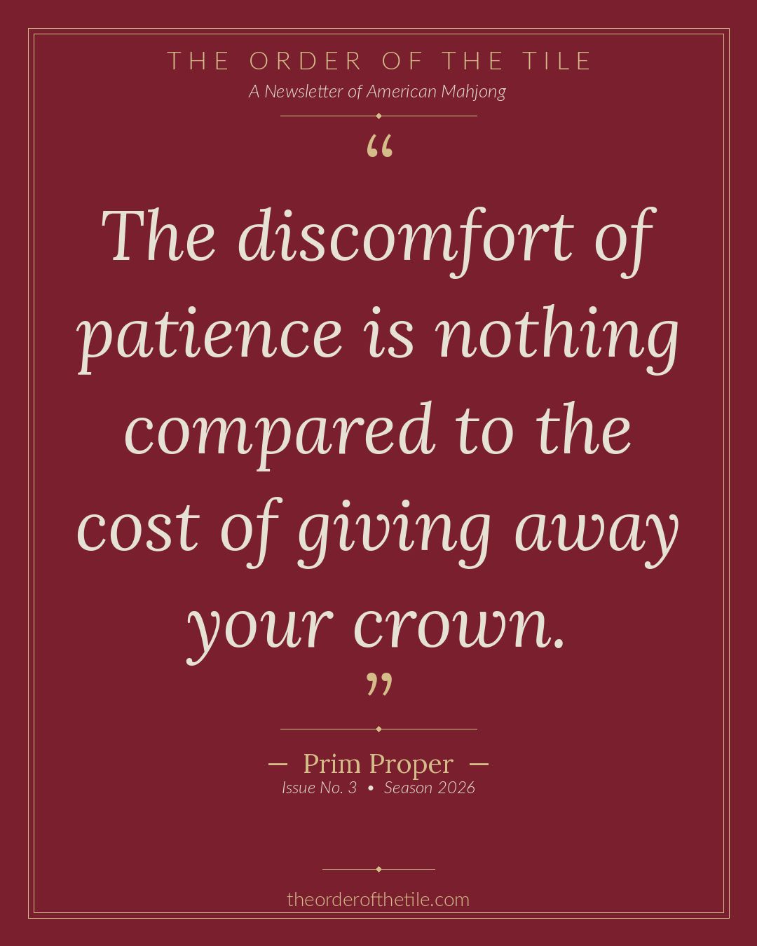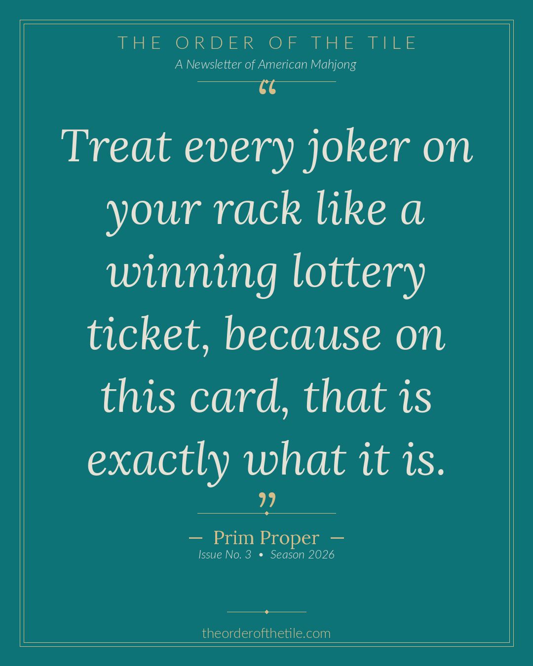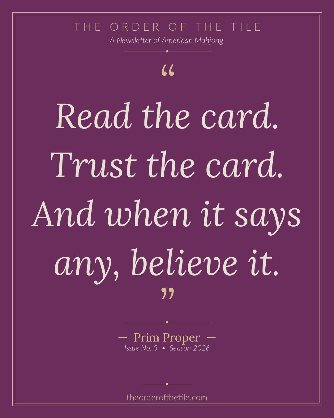 The Order of the Tile is a weekly newsletter for the American Mahjong community. New issues drop every Thursday.